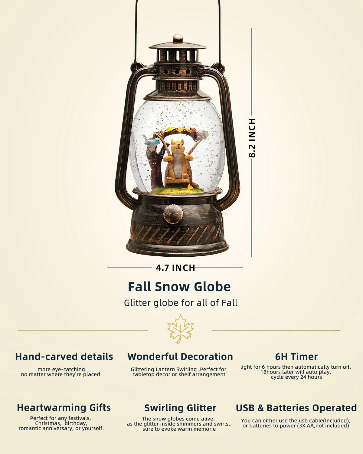 - Squirrel Decorations:With a simple on/off switch, these snow globes are effortless to use.The thanksgiving snow globes come alive, as the glitter inside shimmers and swirls."Just insert batteries (not included) or use USB, and you can enjoy their magical glow instantly