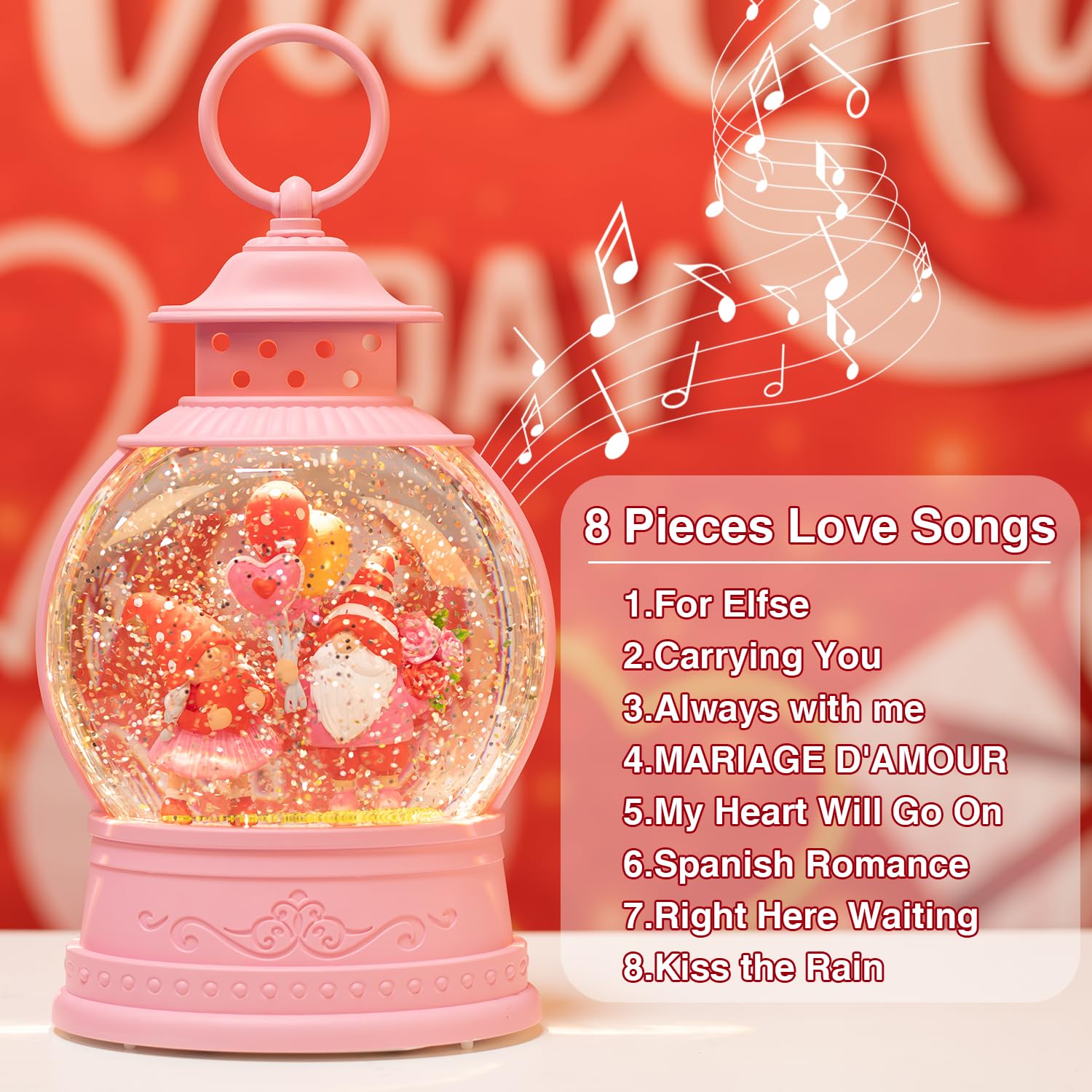 - 💖Musical & 6H Timer: 8 Love songs will be played in a loop.Light the snow globe with USB power cable (Included) or 3 AAA batteries( Not Included).①ON1(light up/Music/6H Timer)/②OFF/③ON2(light up/6H Timer). Slide to ON1 position, the snow globe lantern will light, 6h Timer and music playing. Slide to ON2 position, the lantern will light up and 6H Timer, light for 6 hours then automatically turn off, Repeats every 24 hours.